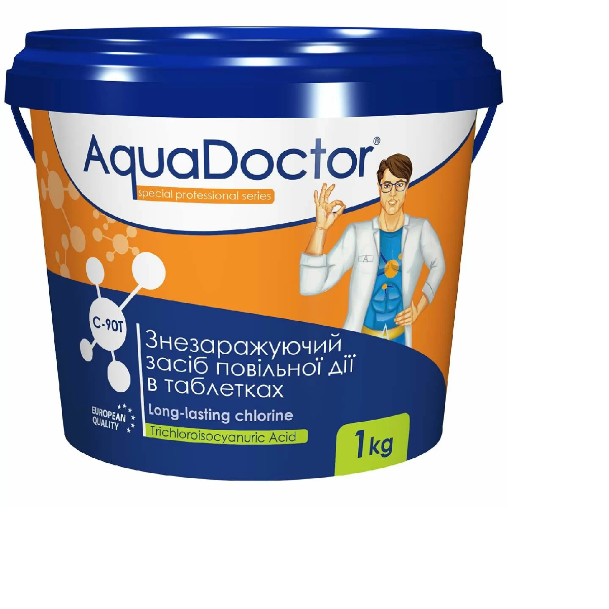 Таблетки необхідно класти в скіммерний кошик, плаваючий дозатор хімії або хлоратор. Використання препарату Аквадоктор С90-Т не веде до утворення осаду і засмічення фільтрів, розчиняється повільно і без залишку. Ефективно дезінфікує за будь-якої жорсткості води.