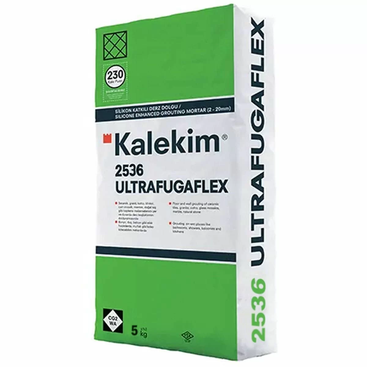 Kalekim Ultrafuga Flex 2536 – це еластична фуга із силіконом на цементній основі. Призначена для заповнення швів облицювальних матеріалів із кераміки, граніту, котто, клінкеру, скляної мозаїки, мармуру і природного каменю, завширшки від 2 до 20 мм. Використовується для проведення внутрішніх і зовнішніх робіт в приміщеннях із підвищеною вологістю: басейни, сауни, лазні та гарячі джерела. Легко очищається, має високу зносостійкість. Швидко застигає, створює гладку водовідштовхувальну поверхню.