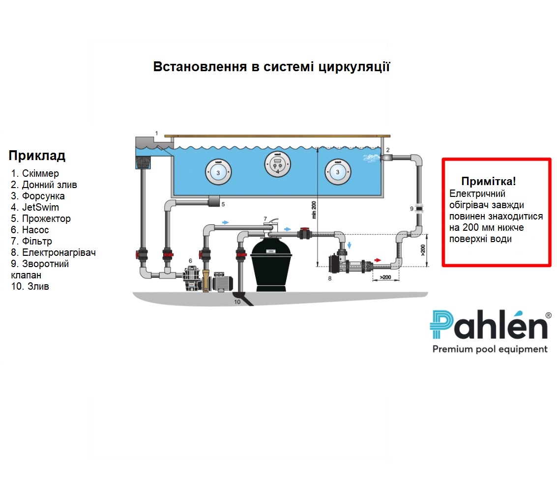 Нагрівачі для басейну мають потужність: 3, 6, 9, 12, 15, і 18 кВт.
