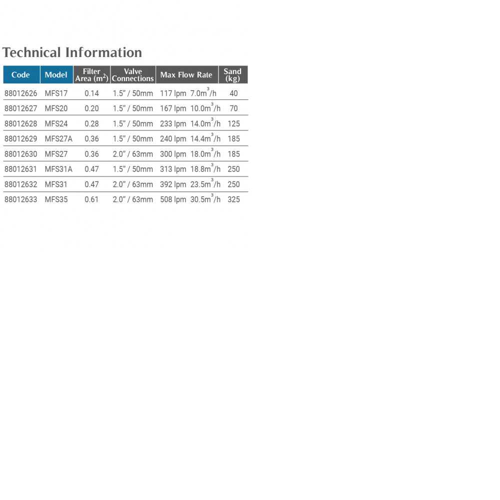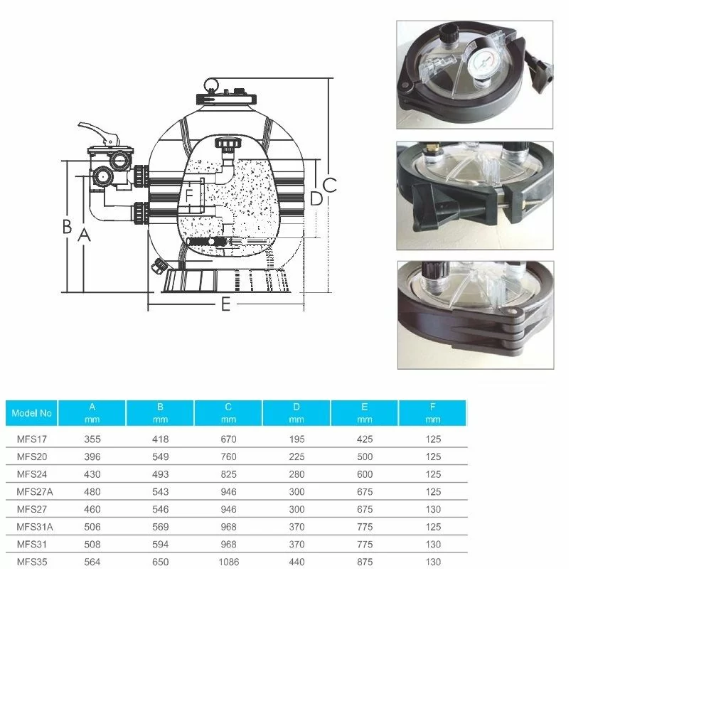 Бічний фільтр MFS20 для механічного очищення води в приватних плавальних і SPA басейнах. Виготовлений з високоміцного поліетилену. Міцний цілісний дутий корпус з верхньою прозорою кришкою на хомуті. Фільтр витримує підвищений тиск, температуру води і оточення. Використовувані матеріали надійні, мають антикорозійні властивості і підходять для використання в будь-яких погодних умовах. Рекомендується для басейнів до 40 м³.