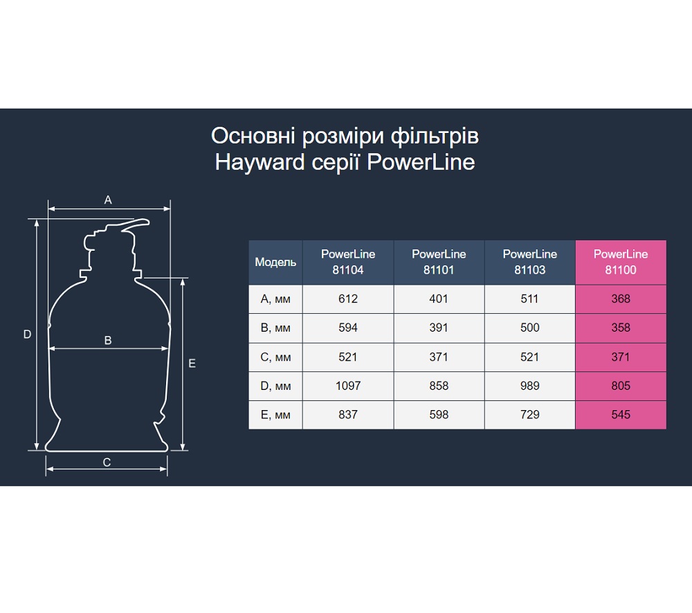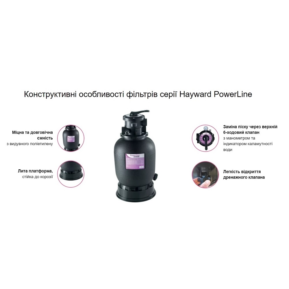 Фільтр пісочного очищення Hayward PowerLine D511 (81103) з верхнім клапаном для відсіювання механічних забруднень, що знаходяться у воді басейну. Використовується для обслуговування невеликих приватних басейнів.