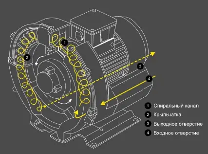 В компресорі встановлений асинхронний двигун потужністю 0,4 кВт. Максимальна продуктивність компресора становить 80 м³/год. Мотор компресора охолоджується зовнішнім вентилятором, розташованим в задній частині двигуна. Усередині алюмінієвого корпусу розташоване робоче колесо, що нагнітає, з лопатями, які перекачують великі об’єми повітря з довкілля в підводний розпилювач. Алюмінієві сплави, що застосовуються для виготовлення бловерів Grino Rotamik, мають низький коефіцієнт лінійного розширення, що дає змогу зберегти мінімальні зазори між корпусом і лопатями робочого колеса в широкому діапазоні температурних режимів роботи. Це забезпечує тривалу роботу з високими характеристиками по продуктивності та долати більший опір.
