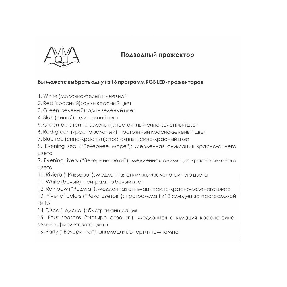 Користувачеві доступні 16 колірних режимів підсвічування води (одноколірні, багатобарвні, динамічні). Перехід в інший режим здійснюється простим натисканням кнопки. Для більш зручного управління режимами можна використовувати додатковий ДУ-пульт Aquaviva RC, синхронізований з контролером прожектора (вбудований).