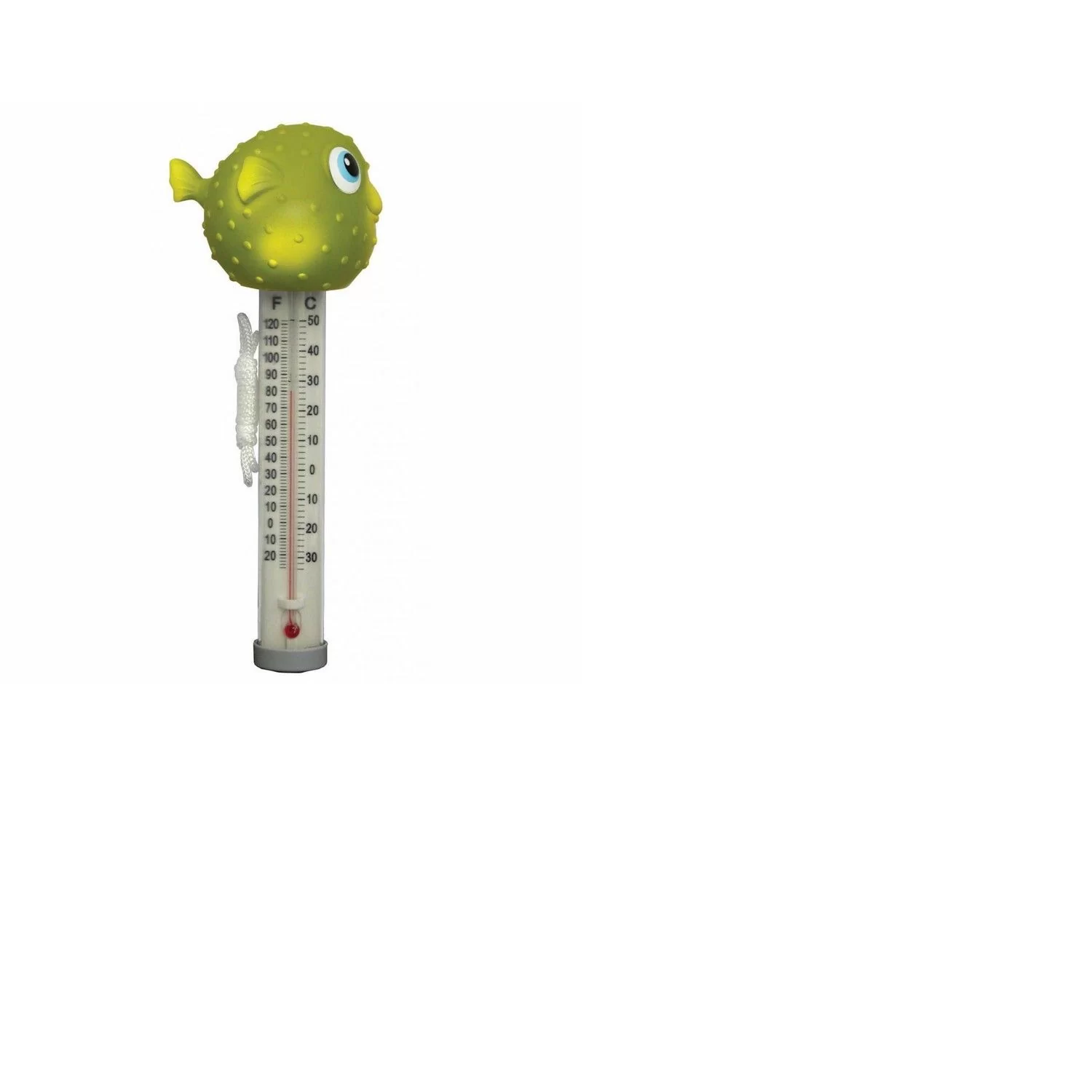 Плаваючий термометр іграшка Kokido K265DIS/6P Рибка-фугу для басейну. Виготовлений з нешкідливого полімеру, не містить скла, ртуті або гострих частин. Має дві шкали – Цельсія і Фаренгейта. Обладнаний плавучим шнурком, який кріпиться до стінки басейну.