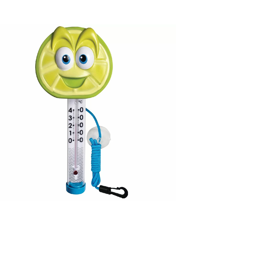 Плаваючий термометр іграшка TM06DIS/C Лайм для басейну. Виготовлений з нешкідливого полімеру, не містить скла, ртуті або гострих частин. Обладнаний плавучим шнурком, який кріпиться до стінки басейну.